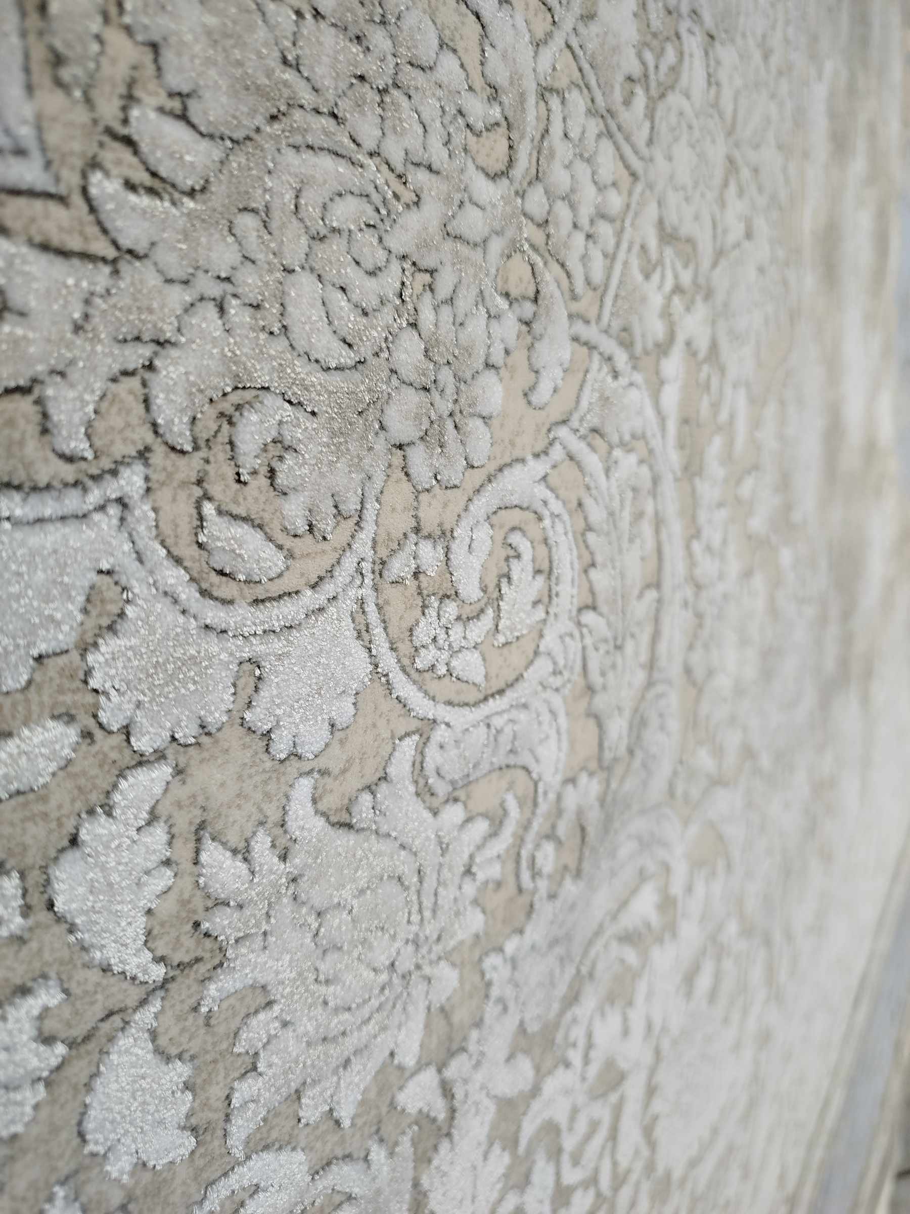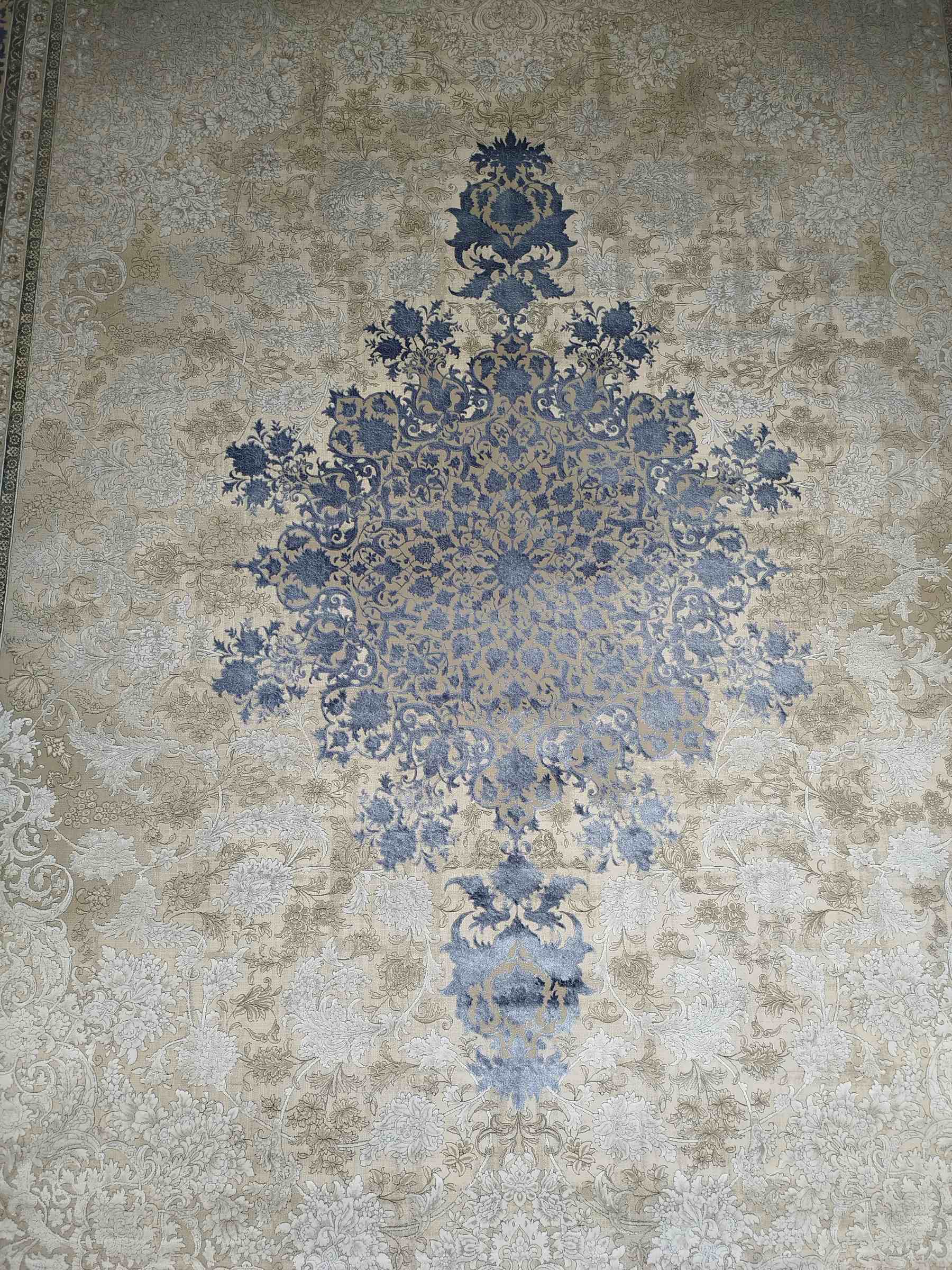 فرش ماشینی خاطره کویر کاشان-طرح گل گندم-رنگ سیلور-1200شانه-3600تراکم