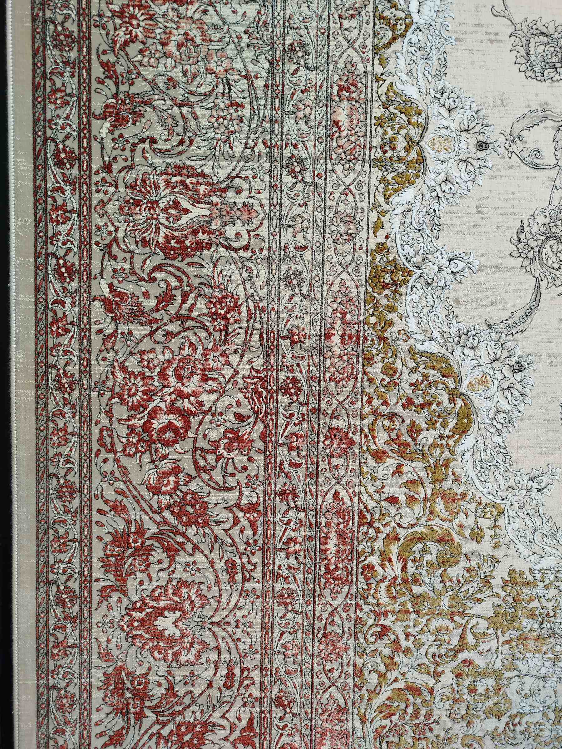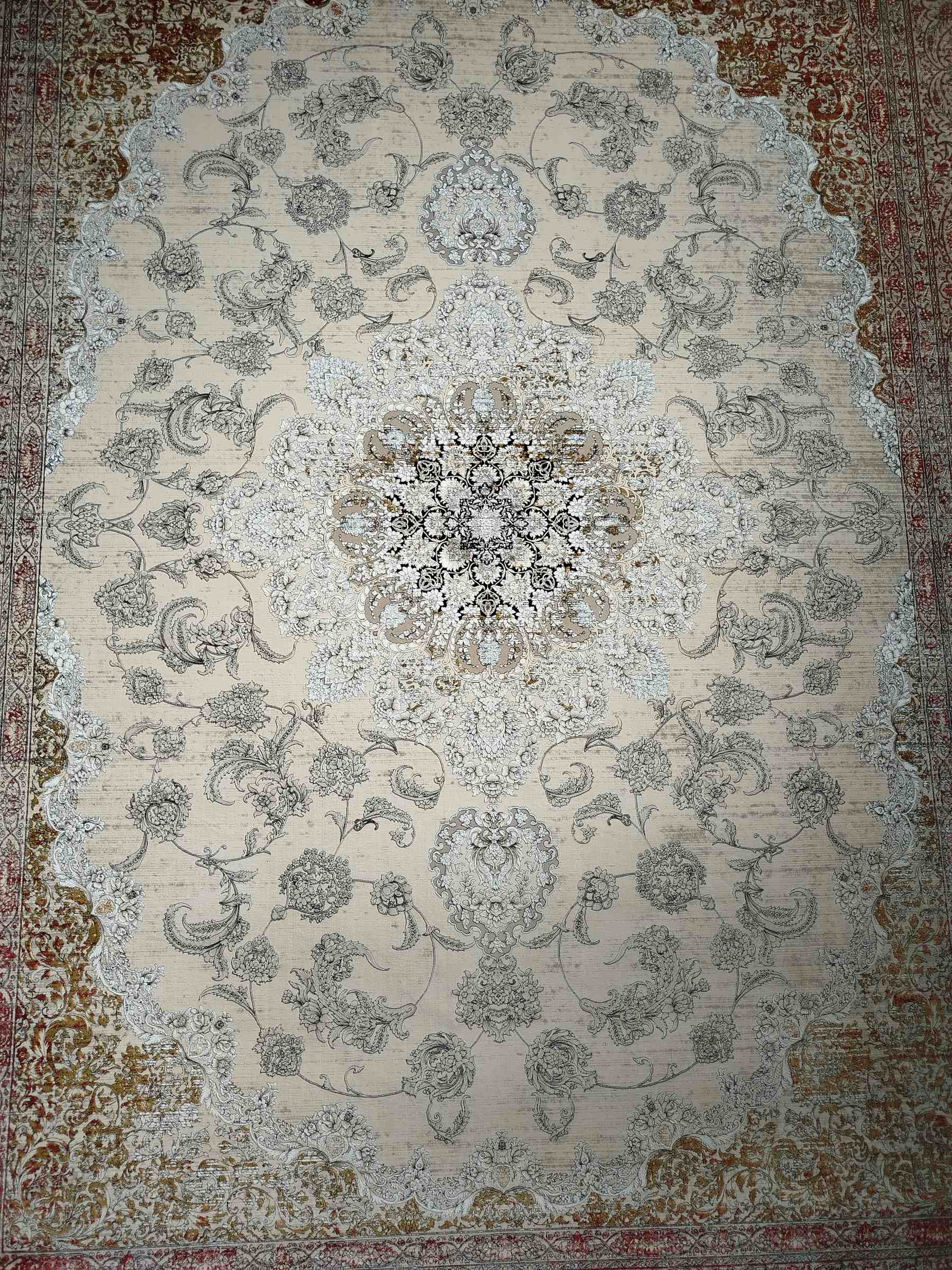 فرش ماشینی خاطره کویر کاشان-کد طرح 3102-رنگ کرم صدفی حاشیهقرمز-1200شانه-3600تراکم عایق مناسبی در برابر حرارت می باشد.
