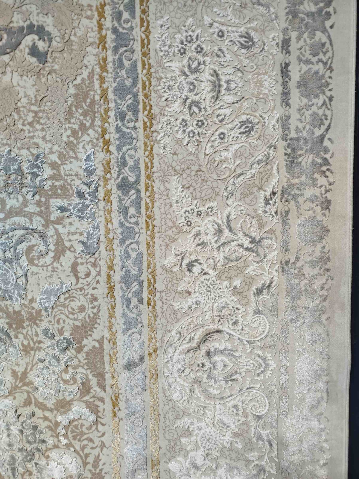 - نوع نخ به کار رفته در فرش ماشینی زمرد مشهد_کد13005_رنگ کرم صدفی_1200شانه_3600تراکم , میتوان به الیاف مودال، ابریشمی، آکریلیک هیتست شده و … اشاره داشت.